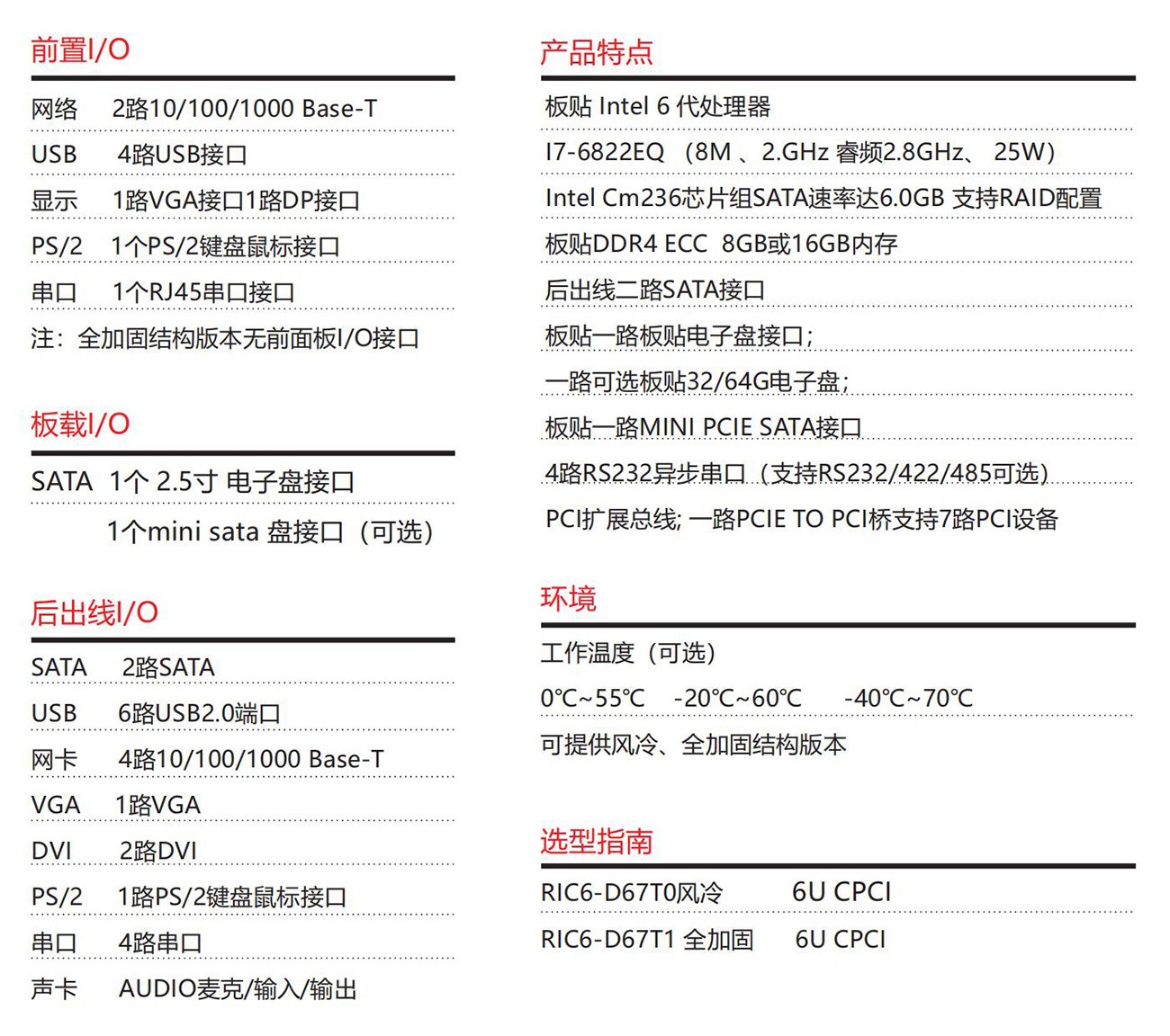 采用Intel? 六代處理器設計方案,CompactPCI 6U 架構 符合 PICMG2.0 R3.0、PICMG2.16、PICMG2.3標準和海軍標主板標準。具備豐富的外圍接口;設計了高效的散熱系統(tǒng),可顯著提高處理器的浮點運算性能,以太網、PCIe to PCI擴展總線, 滿足視頻采集與處理、雷達和聲吶等應用對高速數(shù)據(jù)傳輸?shù)囊?。專為惡劣環(huán)境使用而設計,滿足無人機、裝甲車、水面艦 艇等軍工領域。