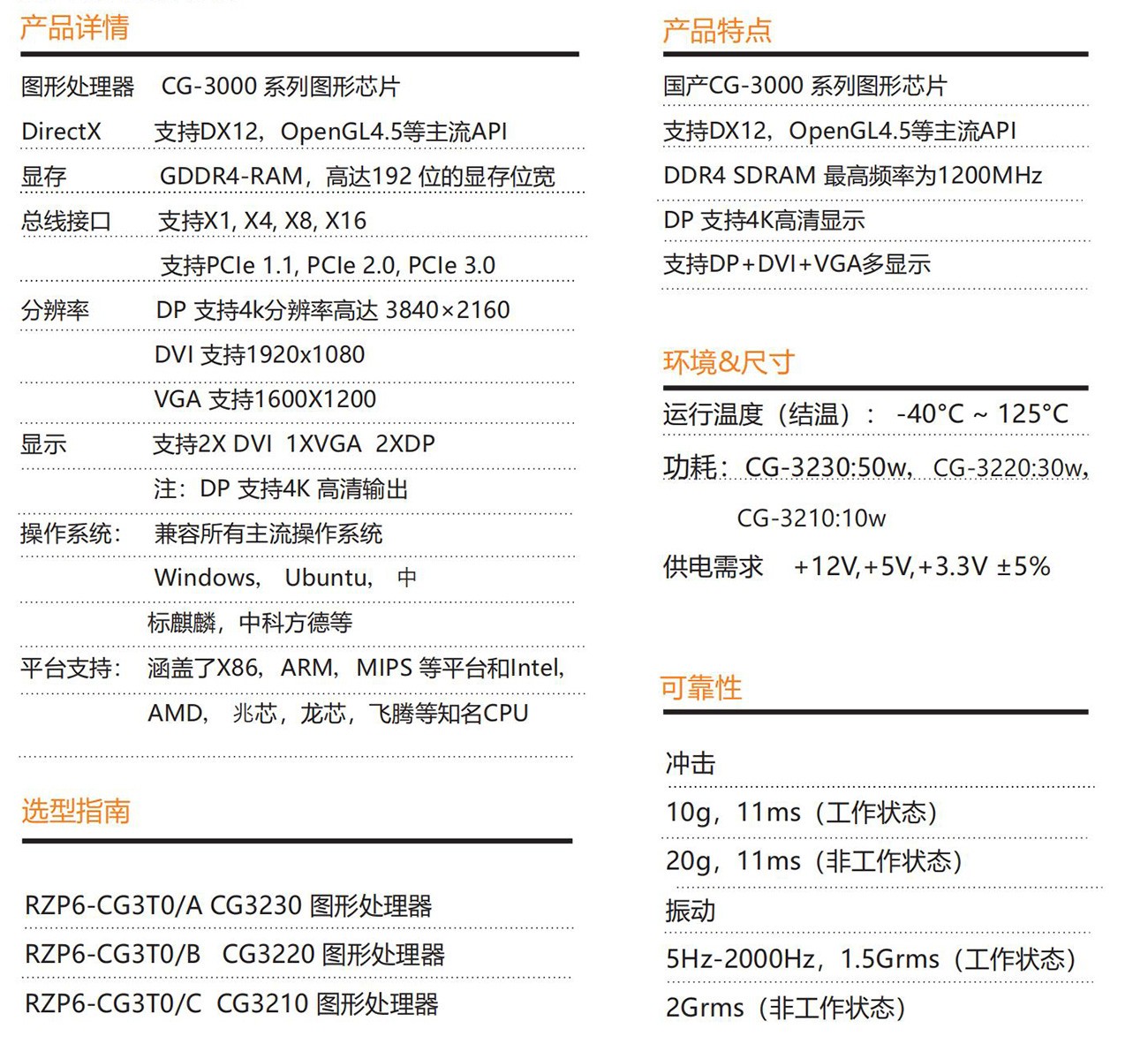 一款CPCI-E 6U 架構(gòu)獨(dú)立顯卡,采用CG-3000 系列芯片 圖形芯片, 是國內(nèi)領(lǐng)先的基于28 納米工藝的完全自主知識(shí)產(chǎn)權(quán)獨(dú)顯GPU 芯片,內(nèi)置自主 研發(fā)的新一代強(qiáng)大的圖像處理引擎,為AI 應(yīng)用做了特別優(yōu)化,完全滿足各 種日常顯示需求。具有多顯示輸出擁有很高的軟件系統(tǒng)兼容性,兼容所有 主流操作系統(tǒng),包括但不限于Windows, Ubuntu, 中標(biāo)麒麟,中科 方德等。硬件系統(tǒng)的支持也涵蓋了X86,ARM,MIPS 等平臺(tái)和Intel, AMD,兆芯,龍芯,飛騰等知名CPU 生產(chǎn)商。獨(dú)有的超低功耗設(shè)計(jì), 助力綠色辦公。所有的制程工藝和周邊器件全部可采用國內(nèi)供應(yīng)商, 確保完全自主可控,能夠應(yīng)對(duì)最復(fù)雜的并行應(yīng)用程序,比如地形繪